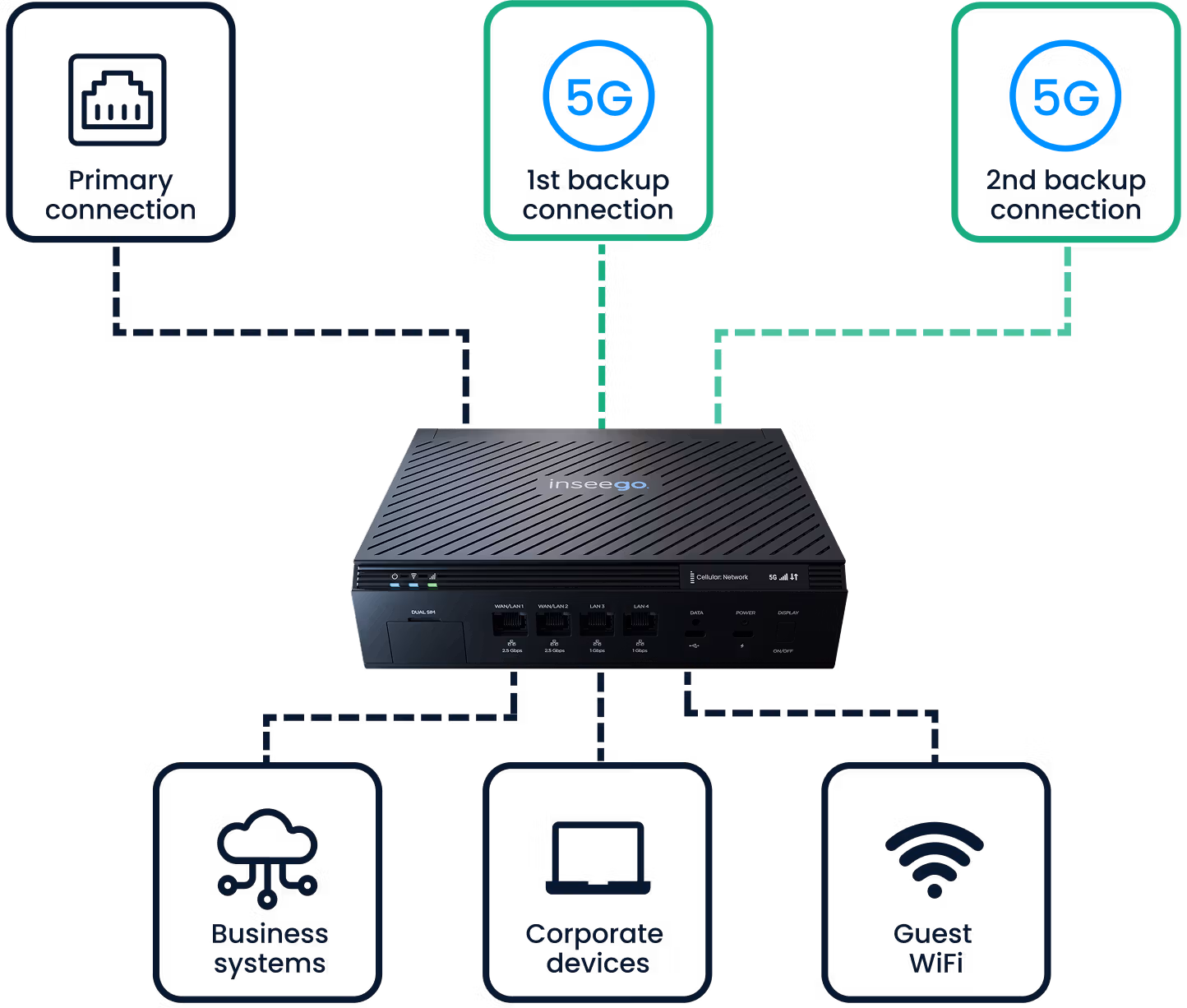Cellular failover automates the swap between your primary internet connection and a cellular connection with dual-band connectivity, keeping your online operations and customer services uninterrupted.