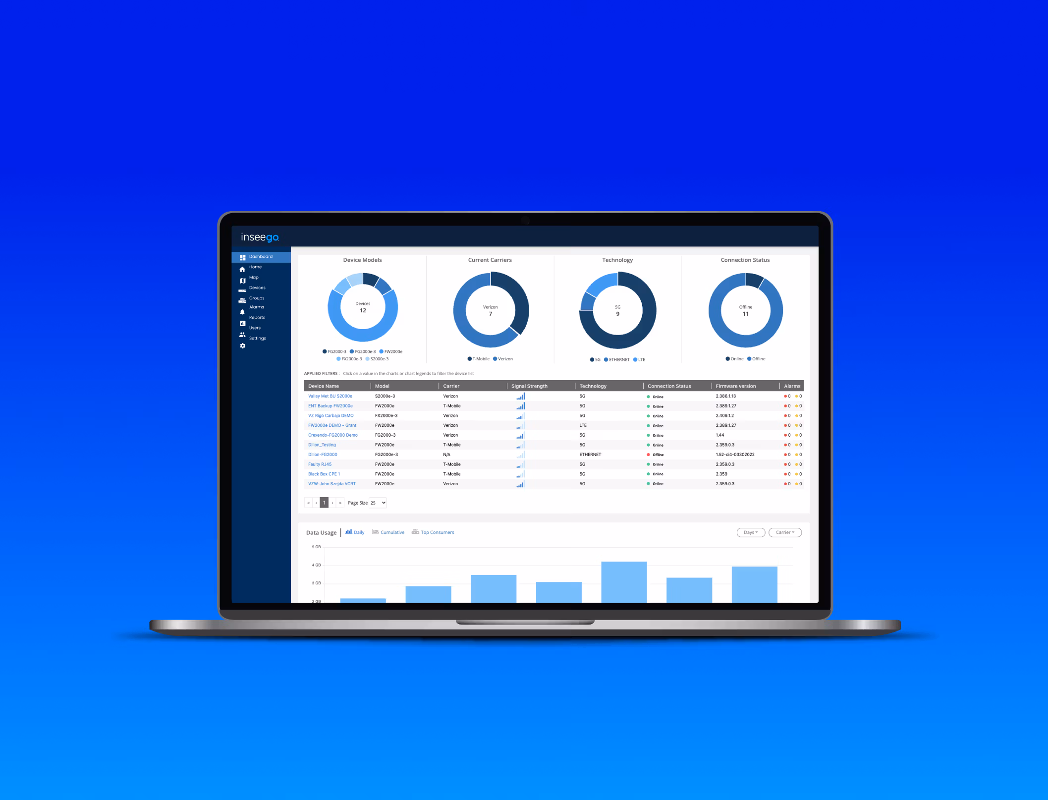 Inseego Connect provides a single, cloud-based dashboard to manage all your devices from anywhere. This allows you to deploy firmware and security updates in bulk, saving time and reducing errors. You can also view real-time data on device status, performance, and usage.