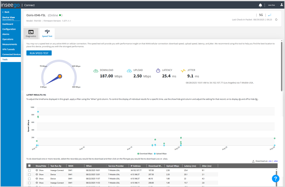 The speed test provides you with performance insight on the device’s current WAN/cellular connection; including: download speed, upload speed, latency, and jitter. You can use this tool to help find the best location for the device.