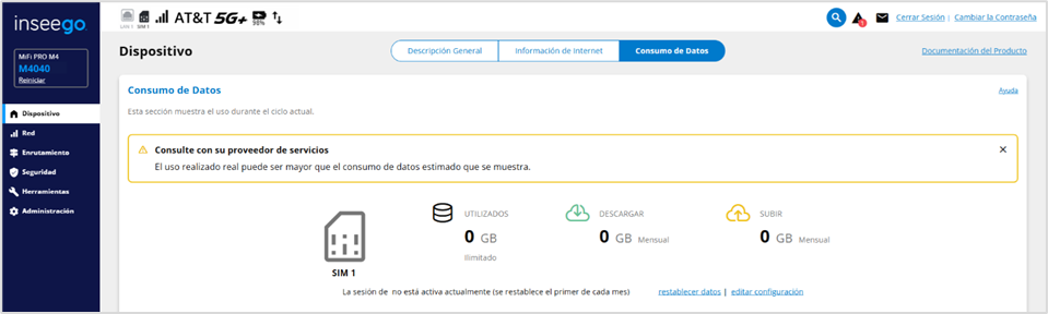 - Una marca de tiempo que indica cuándo comenzó la sesión de internet actual, cuánto tiempo lleva activa y cuándo está programado el reinicio del contador de datos.