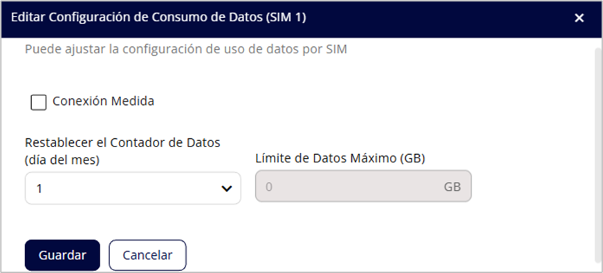Restablecer el Contador de Datos (día del mes): Utilice el menú desplegable para seleccionar un día del mes en el que se restablecerán los datos de uso.