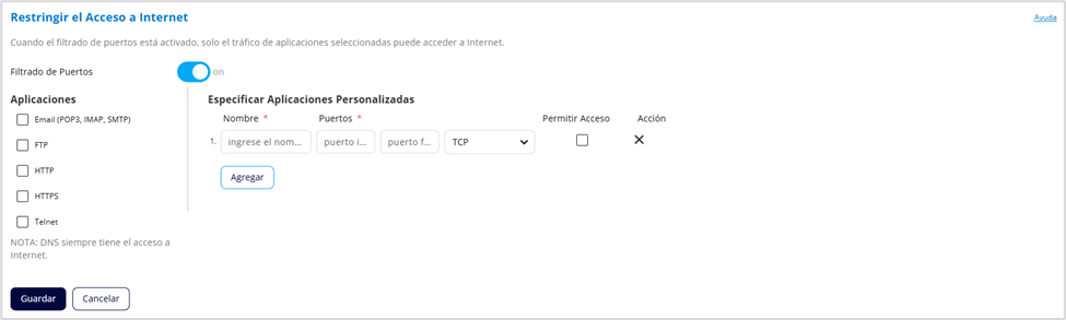 Esta sección le permite bloquear conexiones a Internet salientes y permitir que sólo aplicaciones seleccionadas accedan a Internet mediante el filtrado de puertos.