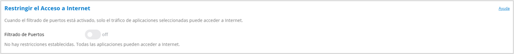 Filtrado de Puertos: Para habilitar el filtrado de puertos y seleccionar qué aplicaciones pueden acceder a Internet, mueva el control deslizante a la posición activado.
