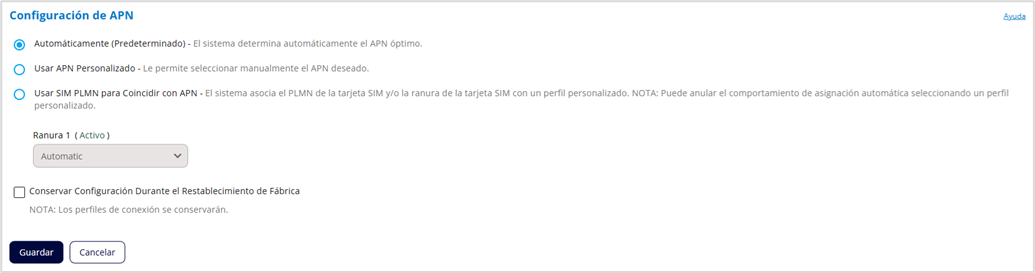 Conservar Configuración Durante el Restablecimiento de Fábrica: Cuando esta casilla esté marcada, la configuración de APN se mantendrá incluso después de restablecer el dispositivo a la configuración de fábrica.