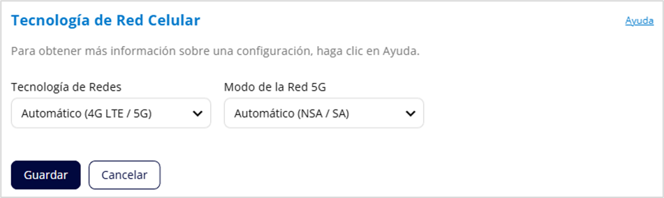 Tecnología de Redes: Tu MiFi viene configurado de forma predeterminada en Automático (4G LTE/5G), lo que prioriza la red 5G, pero permite el uso de 4G y otras tecnologías que no sean 5G. Si seleccionas 4G LTE o 5G en el menú desplegable, tu MiFi no podrá conectarse a redes que no utilicen esa tecnología. Por ejemplo, si seleccionas 4G LTE, tu MiFi no podrá conectarse a redes 5G.