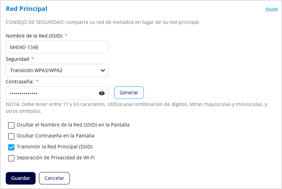 Transmitir la Red Principal (SSID): Esta opción está marcada por defecto, lo que permite que la red Wi-Fi principal se muestre en la lista de redes Wi-Fi disponibles en los dispositivos que intentan conectarse. Si decide desmarcar esta opción, esta red no será visible para los dispositivos que intenten conectarse.