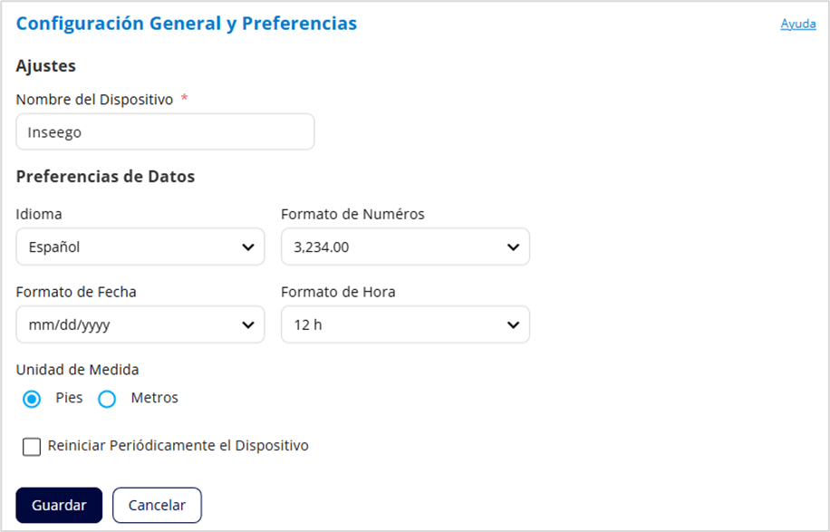 Unidades de Medida: Seleccione el formato de la distancia que se muestra en la interfaz web (pies o metros).