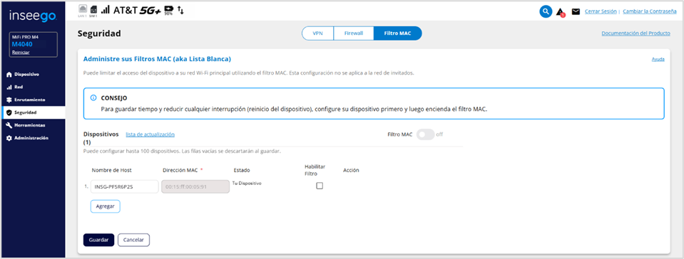 El filtro MAC permite que solo los dispositivos seleccionados accedan a la red del MiFi a través de DHCP. Por defecto, el filtro MAC está desactivado.