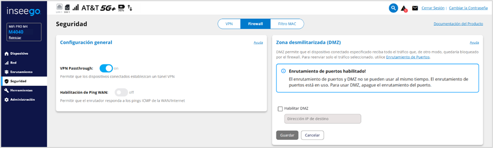 El firewall de MiFi determina qué tráfico de internet se permite entre tu MiFi y los dispositivos conectados, y protege estos últimos del tráfico malicioso proveniente de internet. El firewall no se puede desactivar. Usa la pestaña Firewall para permitir el paso de VPN, habilitar las solicitudes de ping WAN o designar un dispositivo específico para recibir todo el tráfico.