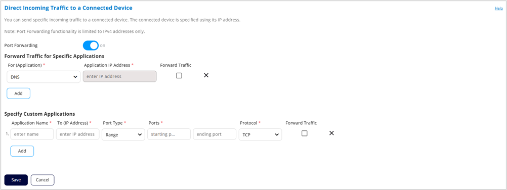 To forward all inbound WAN traffic on a specific port to a single LAN client, enter the IP address of the target device in the Application IP address field.