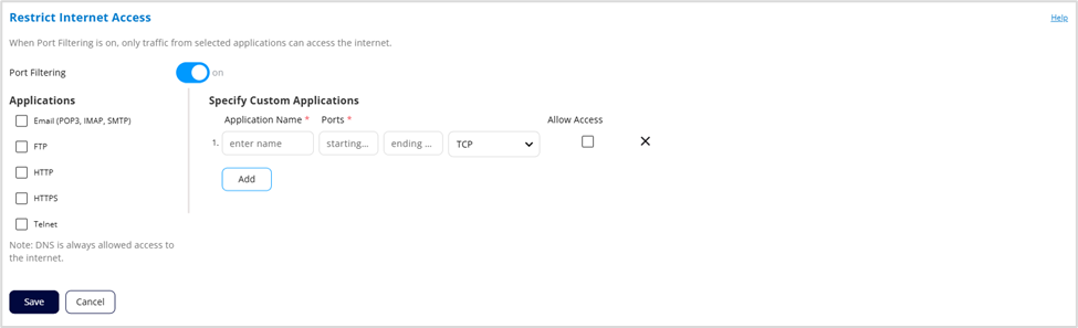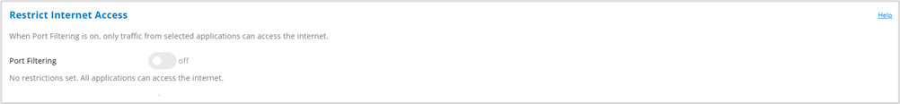 Port Filtering: To enable port filtering and select which applications can access the internet, move the slider to on.