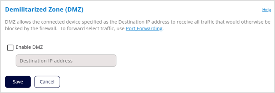 Enable DMZ: Check this box to allow DMZ and enter the IP address of the connected device you want to receive all traffic that would otherwise be blocked by the firewall (the DMZ destination). You can see the IP address of each connected device on the Network > Devices tab.
