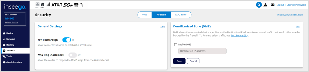 The MIFI firewall determines which internet traffic is allowed to pass between your MiFi and connected devices and protects your connected devices from malicious incoming traffic from the internet. The firewall cannot be turned off. Use the Firewall tab to allow VPN Passthrough, enable WAN ping requests, and/or designate a specific device to receive all traffic.