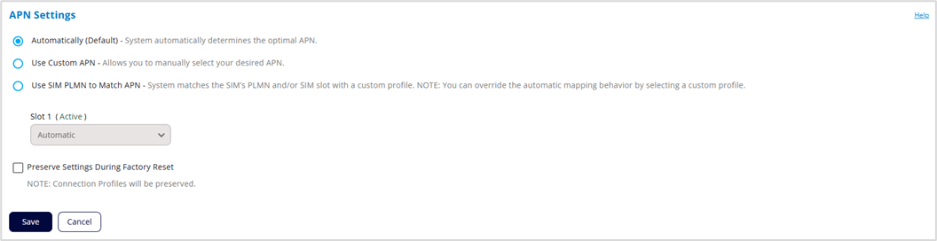 Use SIM PLMN to Match APN – The system automatically sets the profile for the SIM based on a PLMN match between the SIM and the custom connection profiles in the APN Connection Profiles section below. If there is no PLMN match, the system selects a profile without a PLMN. You can also manually select profiles for the SIM.