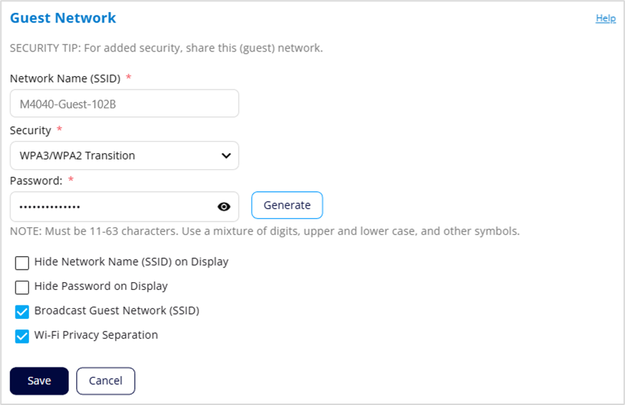 Broadcast Primary Network (SSID): This option is checked by default, allowing the guest network to be displayed in the list of available Wi-Fi networks on connecting devices. If you choose to uncheck this option, this network is not visible to connecting devices.