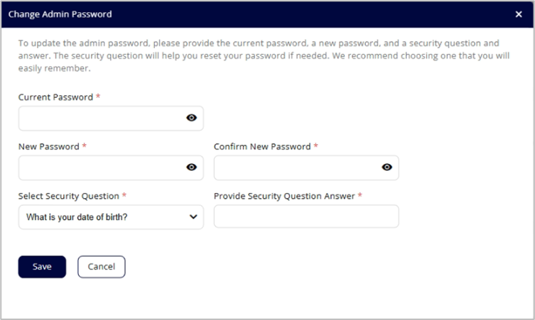 - Enter your current admin password, then enter a new password and confirm it.