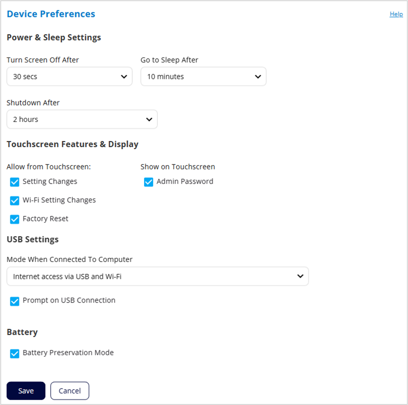 Use this section to set power and sleep settings, configure options for the MiFi touchscreen, set USB modes, and turn battery preservation mode on or off.