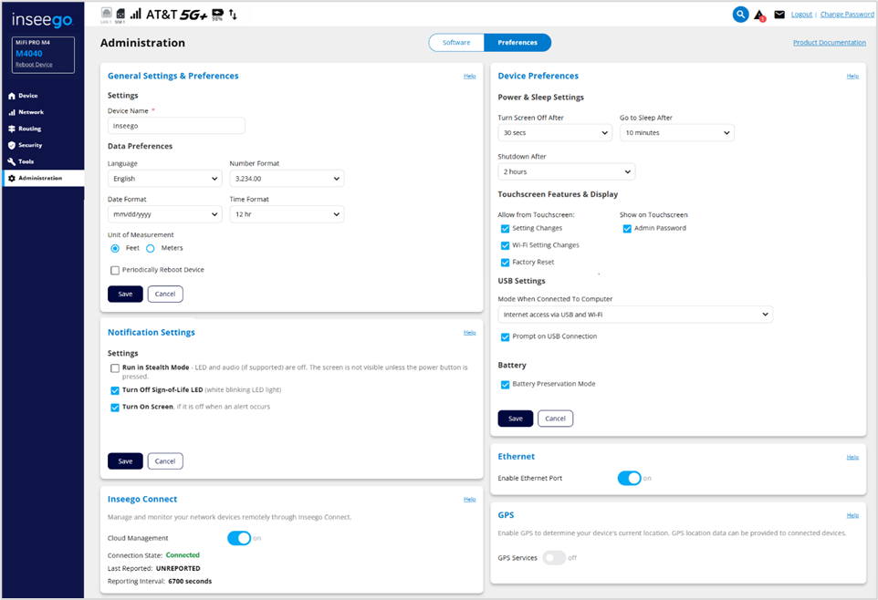 Use this tab to set device preferences such as language, select touchscreen and notification settings, and enable or disable connection to Inseego Connect, Ethernet, and GPS.