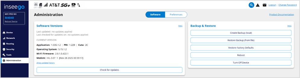 Use this tab to check or update software for your MiFi in your network, and to backup and/or restore settings.