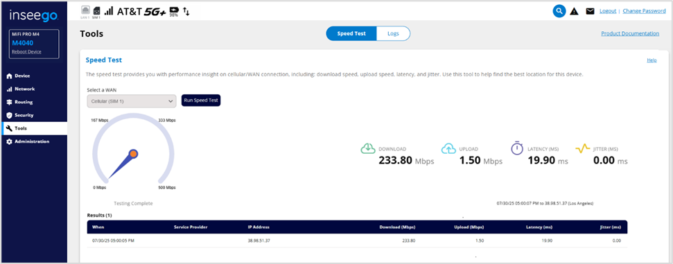 You can run a speed test on any active WAN/cellular connection. The speed test provides you with performance insight on that connection, including: download speed, upload speed, latency, and jitter. You can use this tool to help find the best location for your MiFi.