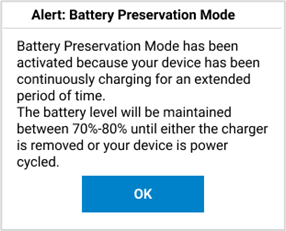 Battery Preservation Mode is designed for users that typically keep their MiFi plugged in for extended periods (over 24 hours at a time). Batteries that continuously hold a full charge have been shown to lose charge capacity over time and have reduced longevity. To avoid any loss of battery integrity, Battery Preservation Mode activates on your MiFi when it has charged for more than 16 hours straight. With Battery Preservation Mode, the battery level is allowed to fall to 70% and then your MiFi maintains a charge of 70% - 80% until you power cycle or remove it from charging. When Battery Preservation Mode is activated, the following message appears: