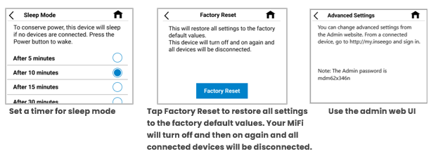 CAUTION: Factory Reset returns your MiFi to factory settings, including resetting the Wi-Fi name and password and admin password. This disconnects all devices.
