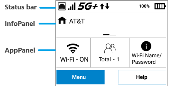 InfoPanel: This panel presents a carousel display of current information on your MiFi. Initially it displays the network name, but may also display other information, such as when Airplane mode is on, or if there is a SIM card error. Swipe left/right through the displays.