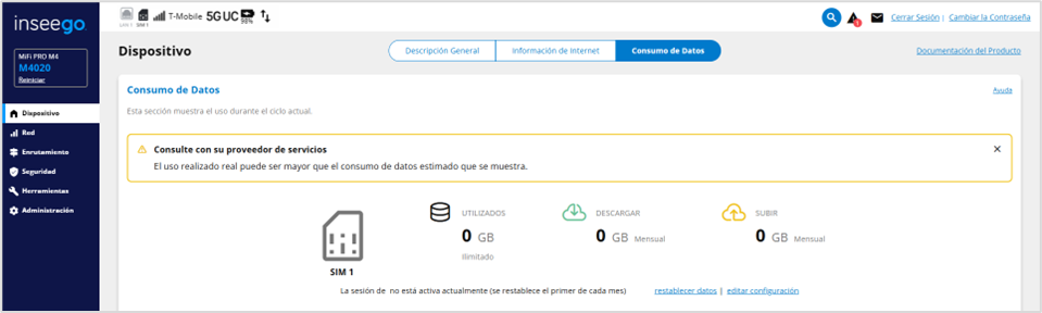 - Una marca de tiempo que indica cuándo comenzó la sesión de internet actual, cuánto tiempo lleva activa y cuándo está programado el reinicio del contador de datos.