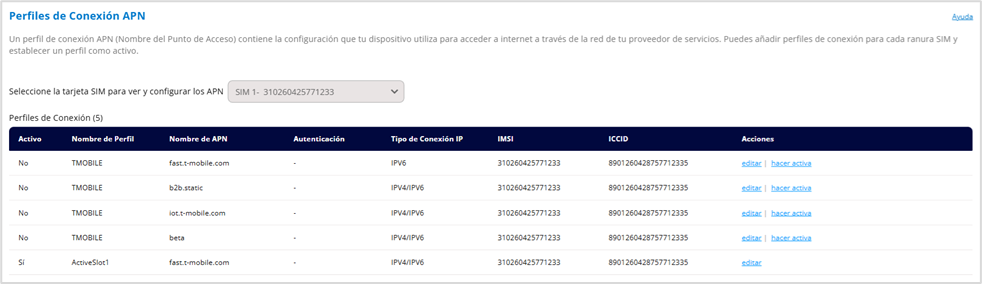 Esta tabla enumera todos los perfiles de conexión APN que se han definido. El número de perfiles aparece junto a este título.