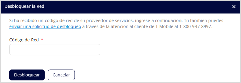 Para obtener un código de red, haga clic en el enlace enviar una solicitud de desbloqueo o siga las instrucciones para contactar con el servicio de atención al cliente de T-Mobile. Introduzca el código en el campo Código de Red y haga clic en Desbloquear.