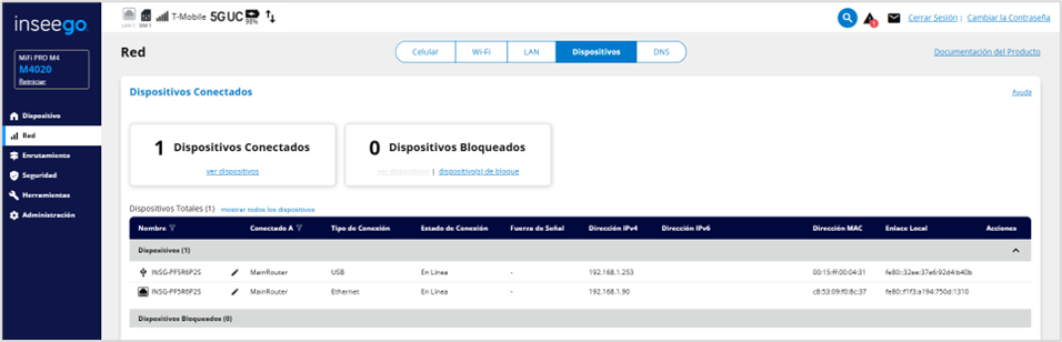 La tabla Dispositivos Totales muestra detalles de todos los dispositivos conectados y de los dispositivos bloqueados.