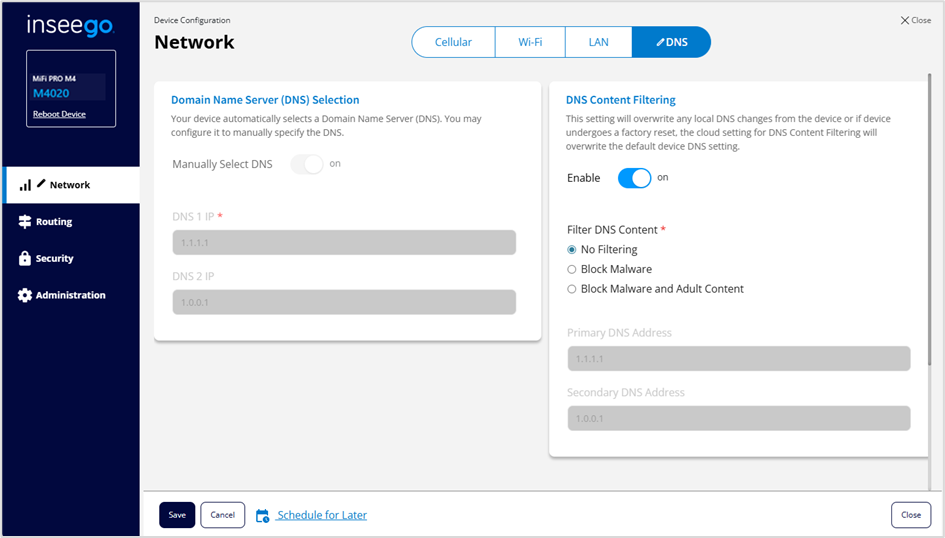 Puedes configurar el filtrado de contenido DNS con Inseego Connect. Inseego Connect es una plataforma de administración de dispositivos de varios niveles que te permite implementar, monitorear y administrar dispositivos IoT de Inseego de forma remota desde la nube. Comunícate con tu equipo de cuentas de T-Mobile para obtener tres meses gratis del complemento Inseego Connect, que te brinda acceso de administrador.