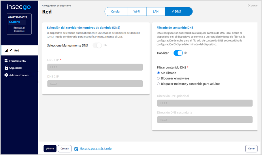 Filtrado de contenido DNS: Seleccione el nivel de filtro (Sin Filtrado, Bloquear el malware o Bloquear malware y contenido para adultos).