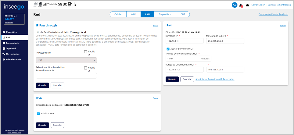 Esta pestaña proporciona ajustes e información sobre la red de área local (LAN) del MIFI. La LAN está compuesta por el dispositivo y todos los dispositivos conectados.