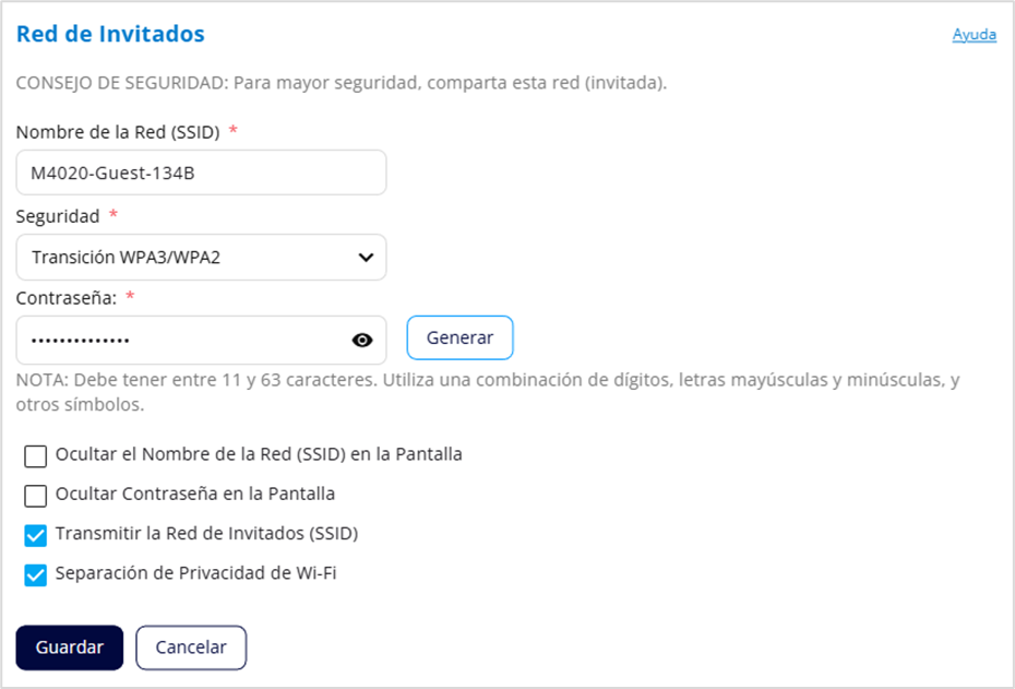 Contraseña: Introduce una contraseña de Wi-Fi o utiliza el botón Generar.