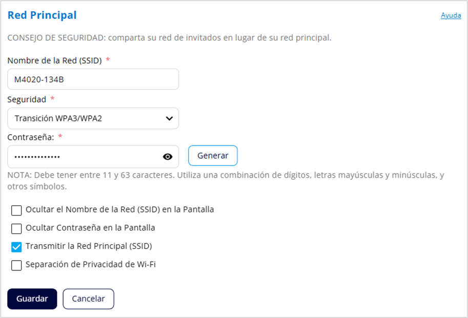 Transmitir la Red Principal (SSID): Esta opción está marcada por defecto, lo que permite que la red Wi-Fi principal se muestre en la lista de redes Wi-Fi disponibles en los dispositivos que intentan conectarse. Si decide desmarcar esta opción, esta red no será visible para los dispositivos que intenten conectarse.