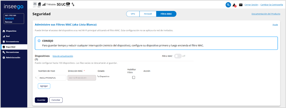 El filtro MAC permite que solo los dispositivos seleccionados accedan a la red del MiFi a través de DHCP. Por defecto, el filtro MAC está desactivado.