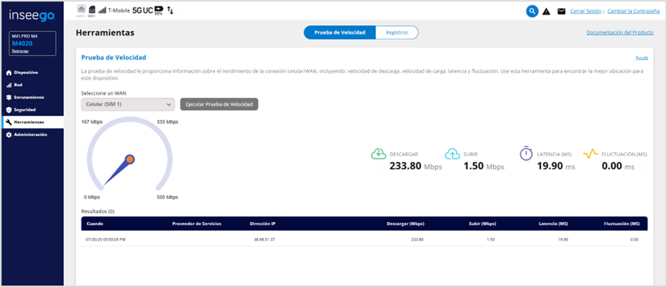 Puedes ejecutar una prueba de velocidad en cualquier conexión WAN/celular activa. Esta prueba te proporciona información sobre el rendimiento de esa conexión, incluyendo: velocidad de descarga, velocidad de subida, latencia y fluctuación. Puedes usar esta herramienta para encontrar la mejor ubicación para tu MiFi.