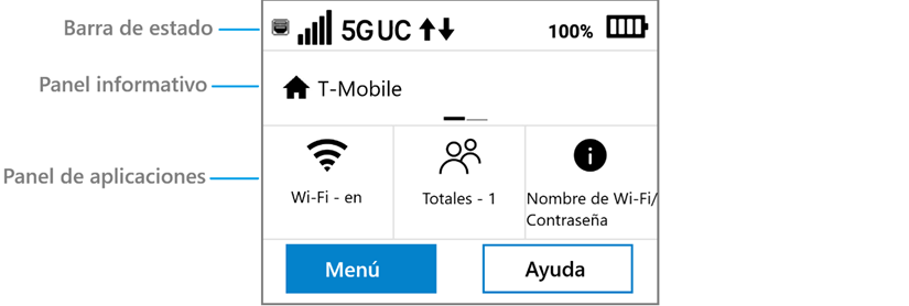 Panel informativo: Este panel muestra un carrusel con la información actual de tu MiFi. Inicialmente, muestra el nombre de la red, pero también puede mostrar otra información, como si el modo avión está activado o si hay un error en la tarjeta SIM. Desliza el dedo hacia la izquierda o hacia la derecha para navegar por las pantallas.