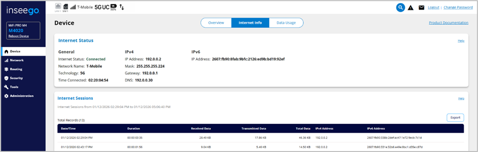 The Internet Info tab provides internet status and internet session information.