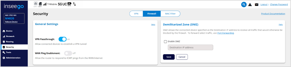 The MIFI firewall determines which internet traffic is allowed to pass between your MiFi and connected devices and protects your connected devices from malicious incoming traffic from the internet. The firewall cannot be turned off. Use the Firewall tab to allow VPN Passthrough, enable WAN ping requests, and/or designate a specific device to receive all traffic.