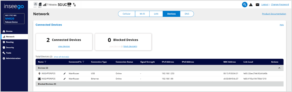 - Click block devices under Blocked Devices to disconnect devices from accessing your network and prevent them from reconnecting. Blocked devices are removed from the Devices section of the table below and appear in the Blocked Devices section.