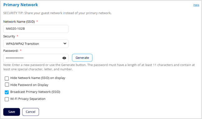 Broadcast Primary Network (SSID): This option is checked by default, allowing the primary Wi-Fi network to be displayed in the list of available Wi-Fi networks on connecting devices. If you choose to uncheck this option, this network is not visible to connecting devices.