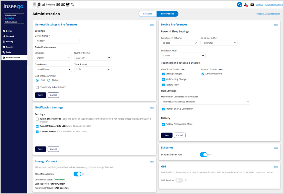 Use this tab to set device preferences such as language, select touchscreen and notification settings, and enable or disable connection to Inseego Connect, Ethernet, and GPS.
