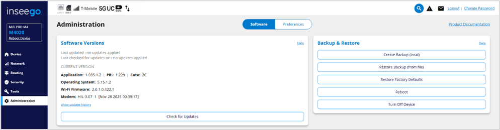 Use this tab to check or update software for your MiFi in your network, and to backup and/or restore settings.