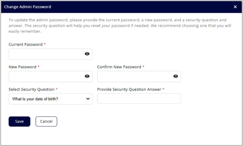 2. Enter your current admin password, then enter a new password and confirm it. NOTE: The new password must have a length between 14 and 32 characters and contain at least one special character and number.