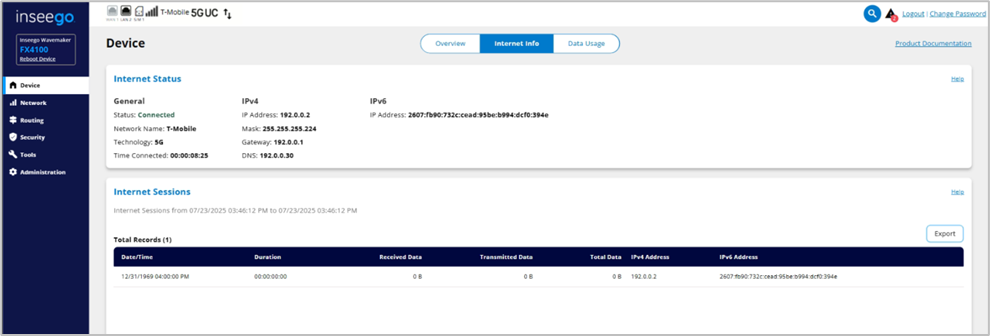 The Internet Info tab provides internet status and internet session information.