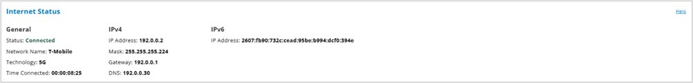 IP Address: The global IPv6 address for the router (blank if IPv6 is turned off or is not supported by the current network connection or operator).