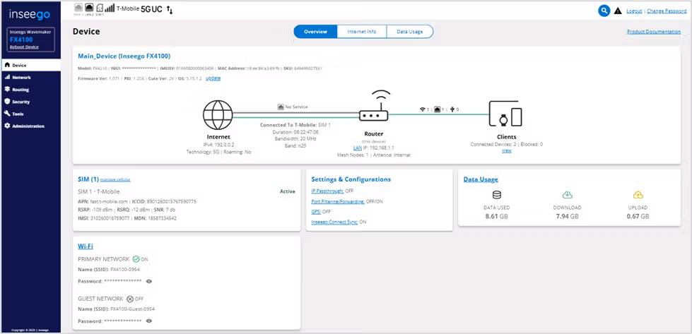 The Device Overview tab is the home page of the admin web UI. Use it to view information about your router at a glance. You can see an overview of your router and network, SIM information, some common settings, data usage stats, and current Wi-Fi networks and passwords. Use the links to jump to a specific topic for more details and configuration options or navigate using the side menu.