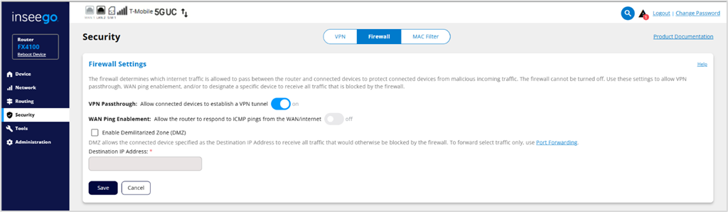 The FX4100 firewall determines which internet traffic is allowed to pass between your router and connected devices and protects your connected devices from malicious incoming traffic from the internet. The firewall cannot be turned off. Use the Firewall tab to allow VPN Passthrough, enable WAN ping requests, and/or designate a specific device to receive all traffic.